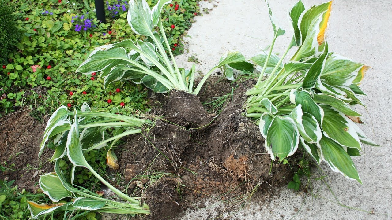 - Выкопайте кусты (хосты, ирисы, пионы), разделите корневища на части острым ножом.